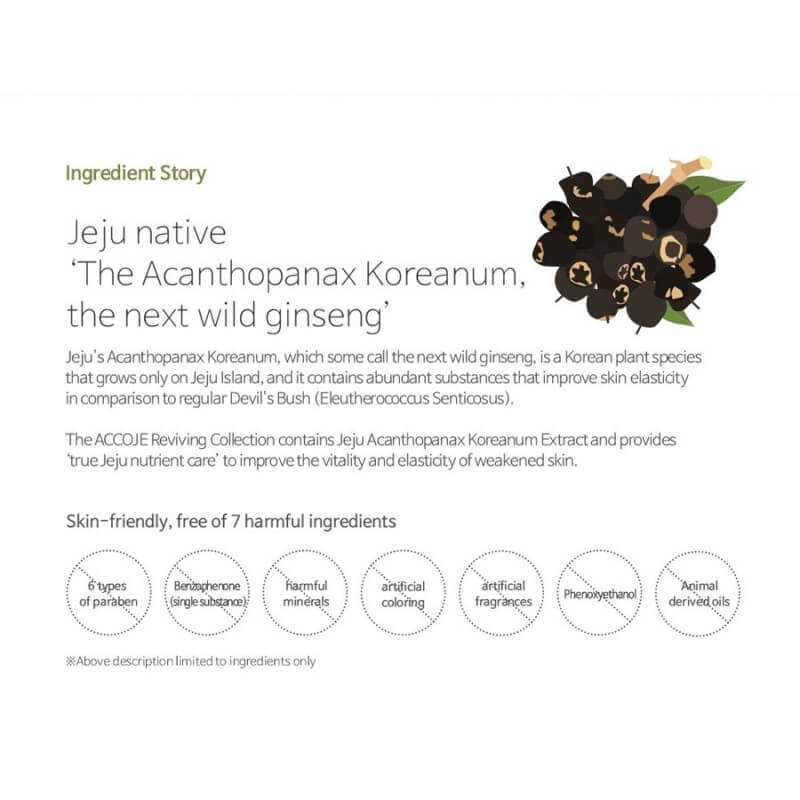 Περιέχει εκχύλισμα Acanthopanax Koreanum , το οποίο ορισμένοι αποκαλούν το επόμενο άγριο τζίνσενγκ. Είναι ένα είδος φυτού που ευδοκιμεί μόνο στο νησί Jeju και περιέχει άφθονες ουσίες που βελτιώνουν την ελαστικότητα του δέρματος.