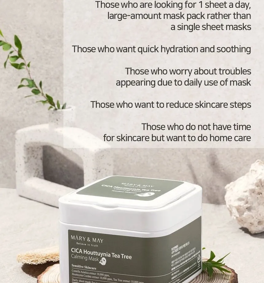 Το πακέτο Cica Houttuynia Tea Tree Calming Mask 30pcs είναι σχεδιασμένο για να προσφέρει άμεση ενυδάτωση και να μειώνει ερυθρότητα και φλεγμονές. Παράλληλα χαρίζει στο δέρμα μια αίσθηση ηρεμίας και φρεσκάδας. Κάνουμε την εφαρμογή συνήθως μετά τον καθαρισμό του προσώπου και την τοποθέτηση τόνερ. Έπειτα, την αφήνουμε να δράσει για περίπου 10-20 λεπτά. Δεν ξεπλένουμε, και μπορεί να χρησιμοποιηθεί σε καθημερινή βάση ή όποτε το δέρμα χρειάζεται άμεση ενυδάτωση και καταπράυνση.