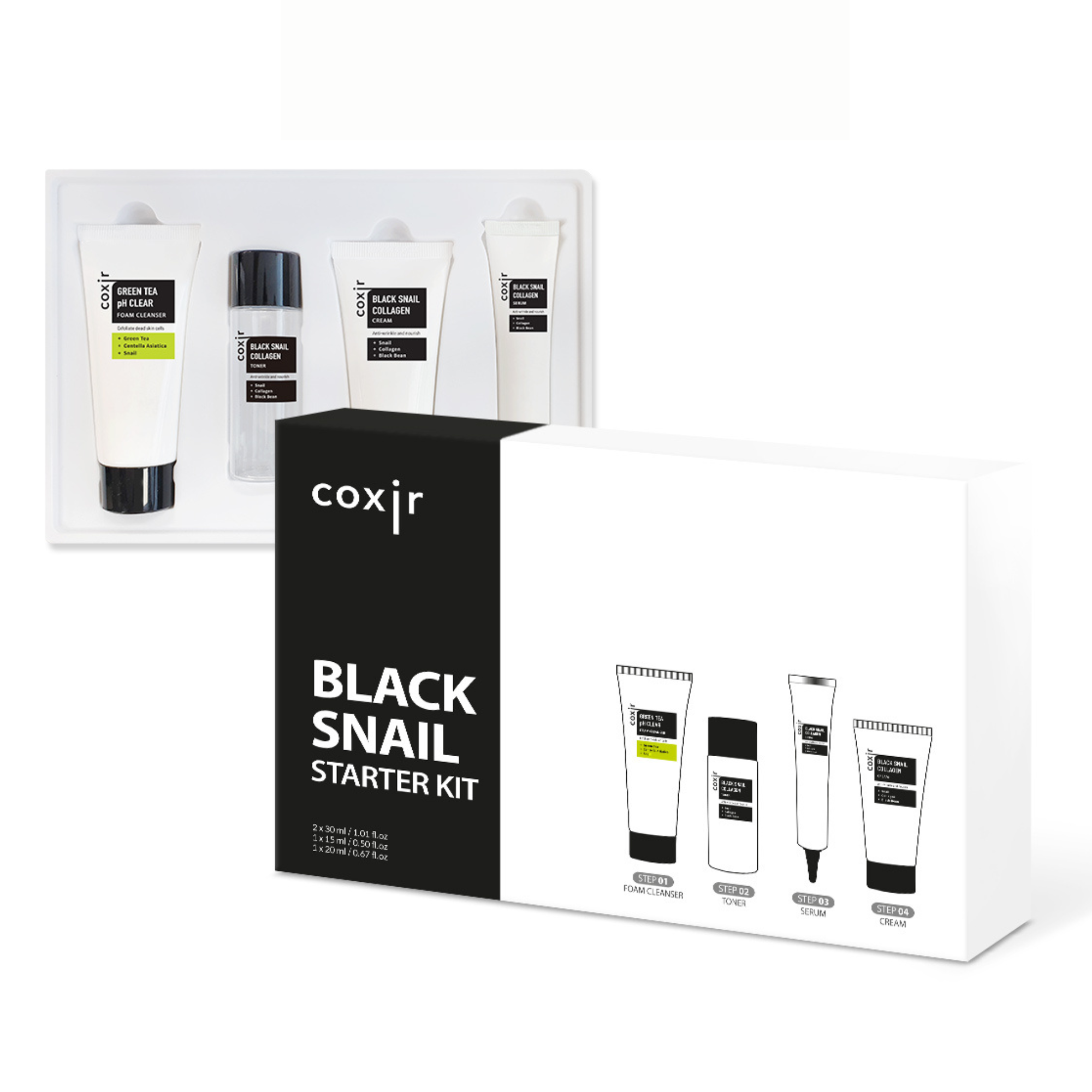 Το COXIR Black snail starter kit αποτελείται από καθαριστικό αφρού για ευαίσθητο δέρμα και τόνερ, ορό & ενυδατική κρέμα με έκκριμα σαλιγκαριού, κολλαγόνο και μαύρη υπερτροφή για σφριγηλό δέρμα γεμάτο ελαστικότητα!!!