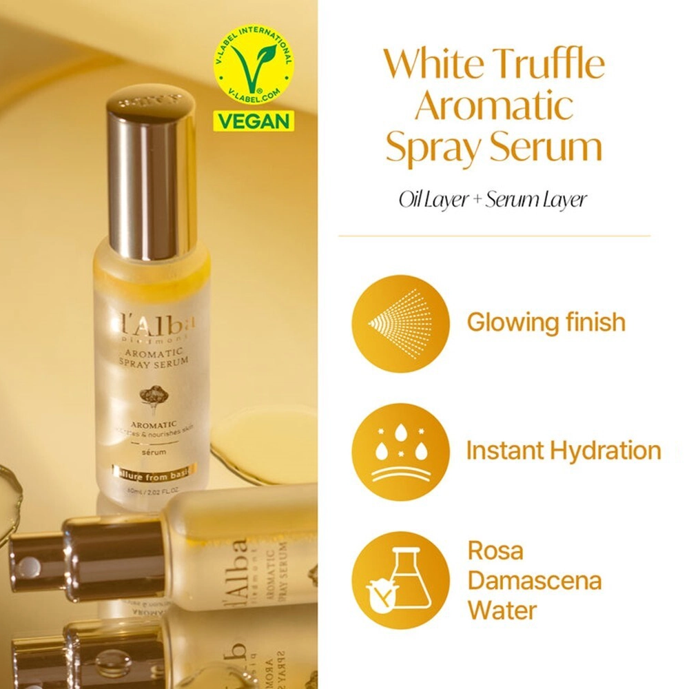 Το d’Alba White Truffle First Aromatic Spray Serum είναι ένα πολυλειτουργικό προϊόν serum σε μορφή spray (mist + serum) που προσφέρει άμεση ενυδάτωση, θρέψη και αναζωογόνηση της επιδερμίδας. Η σύνθεσή του συνδυάζει serum layer και oil layer, τα οποία αναμειγνύονται με ανακίνηση πριν την εφαρμογή, δημιουργώντας μια ελαφριά αλλά θρεπτική υφή που απορροφάται γρήγορα από το δέρμα.