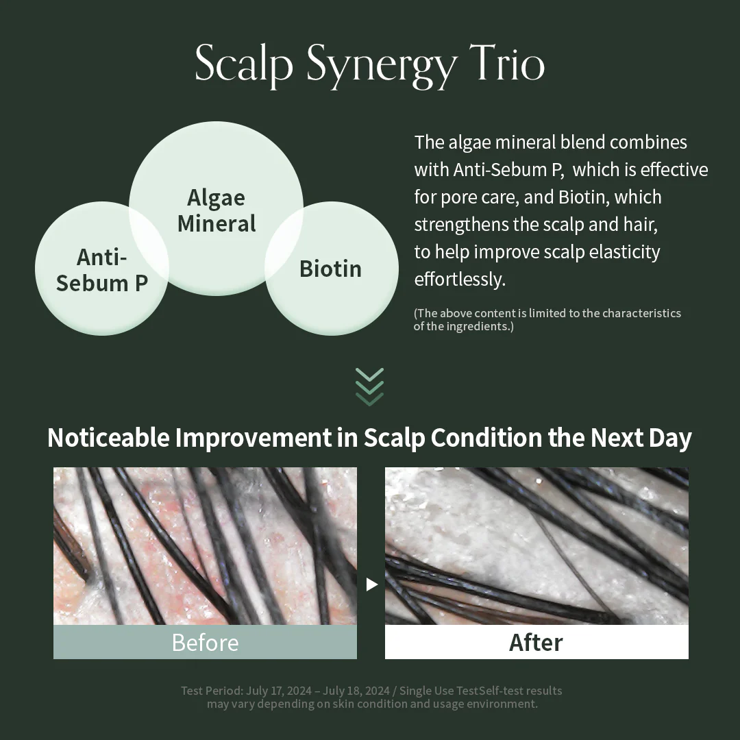 Η σύνθεση περιλαμβάνει ένα ισχυρό Scalp Synergy Trio με μεταλλικά στοιχεία από φύκια, Βιοτίνη και Anti-Sebum P. Ο συνδυασμός αυτός συμβάλλει στην ενίσχυση των ριζών των μαλλιών, βελτιώνει τη δομική ανθεκτικότητα της τρίχας και βοηθά τα μαλλιά να δείχνουν πιο πυκνά και υγιή ήδη από το πρώτο λούσιμο.