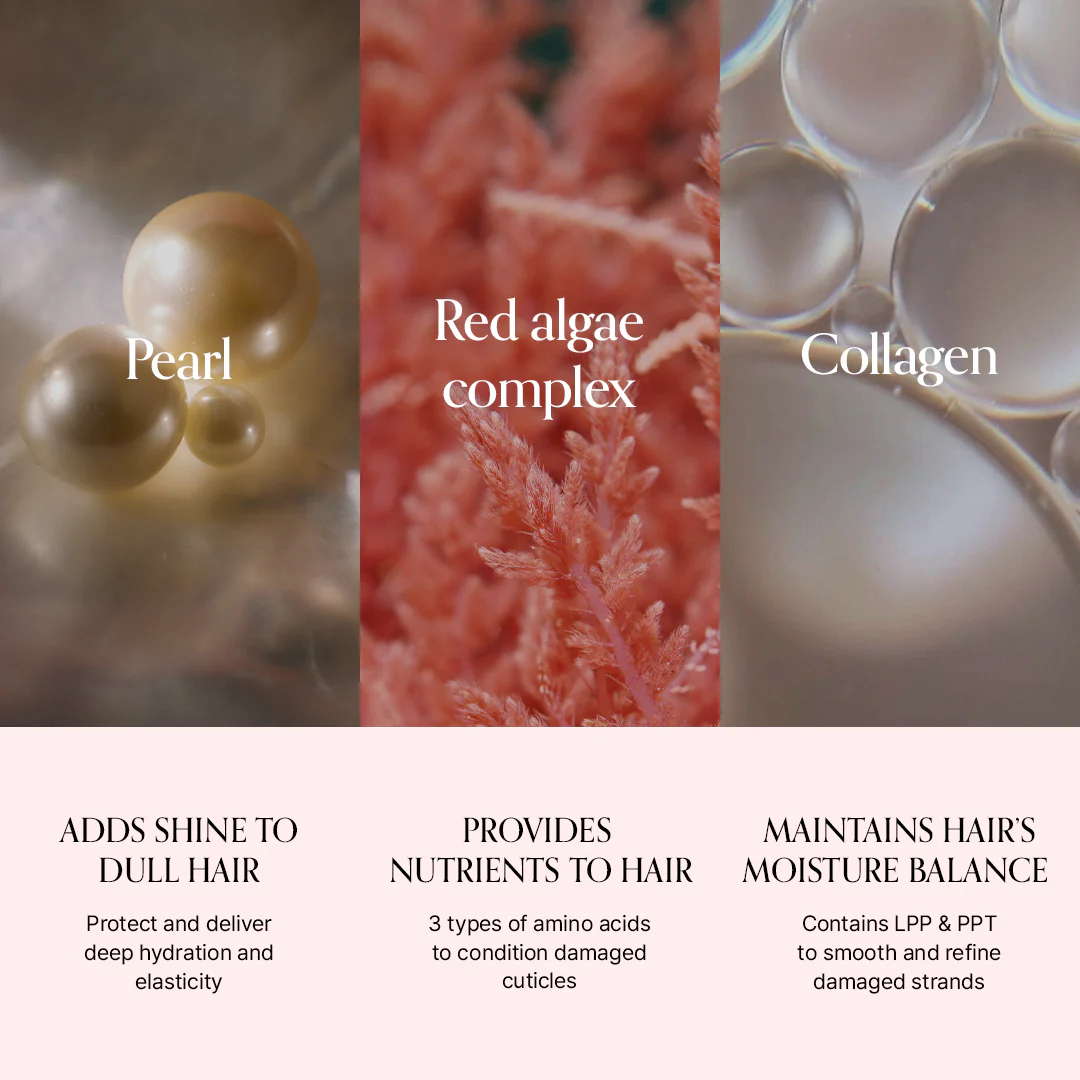 Πλούσιο σε πολύτιμα μέταλλα και αμινοξέα, αυτό το θαλάσσιας προέλευσης σύμπλεγμα προσφέρει έντονη ενυδάτωση και χαρίζει στα θαμπά και ξηρά μαλλιά μια λαμπερή, «μαργαριταρένια» λάμψη.