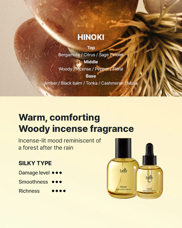 Το λάδι Perfumed Hair Oil Hinoki περιλαμβάνει υψηλής περιεκτικότητας ενυδατικά και θρεπτικά, φυτικής και συστημικής προέλευσης συστατικά: