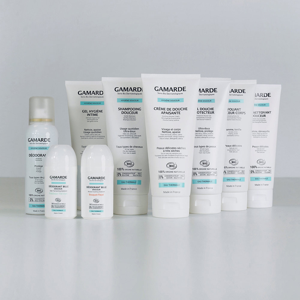 Gamarde aqua (Gamarde Water), aqua (Water), Glycerin, Lavandula angustifolia (Lavender) flower water*, cetearyl alcohol, sodium cocoamphoacetate, lauryl glucoside, parfum (Fragrance), Butyrospermum parkii (Shea) butter*, Helianthus annuus (Sunflower) seed oil*, Argania spinosa kernel oil*, glyceryl stearate citrate, cetearyl glucoside, xanthan gum, glyceryl caprylate, Aloe barbadensis leaf extract*, Maltodextrin*, sodium cocoyl glutamate, sodium lauryl glucose carboxylate, C14-22 alcohols, C12-20 alkyl glucoside, sodium hyaluronate, tocopherol, citric acid. *ingrédient d’origine Biologique
