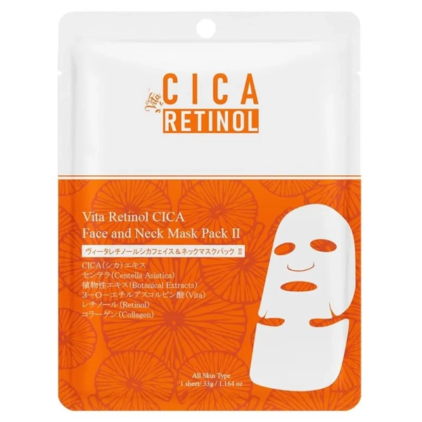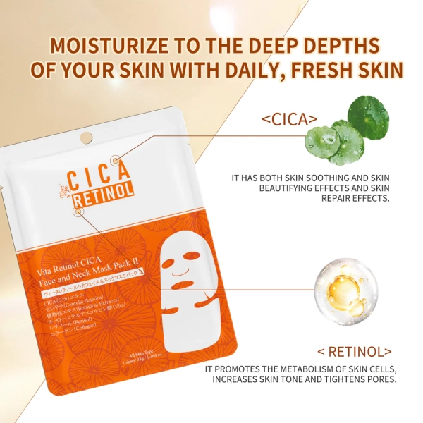 Η Vita Retinol CICA Face & Neck Mask είναι μια προηγμένη μάσκα υφάσματος που αγκαλιάζει όχι μόνο το πρόσωπο αλλά και τον λαιμό, προσφέροντας στοχευμένη φροντίδα ενάντια στα σημάδια γήρανσης. Ο συνδυασμός ρετινόλης και CICA (Centella Asiatica) ενισχύει την ανανέωση των κυττάρων, μειώνει τις ρυτίδες και καταπραΰνει την επιδερμίδα, προσφέροντας παράλληλα βαθιά ενυδάτωση και ελαστικότητα.